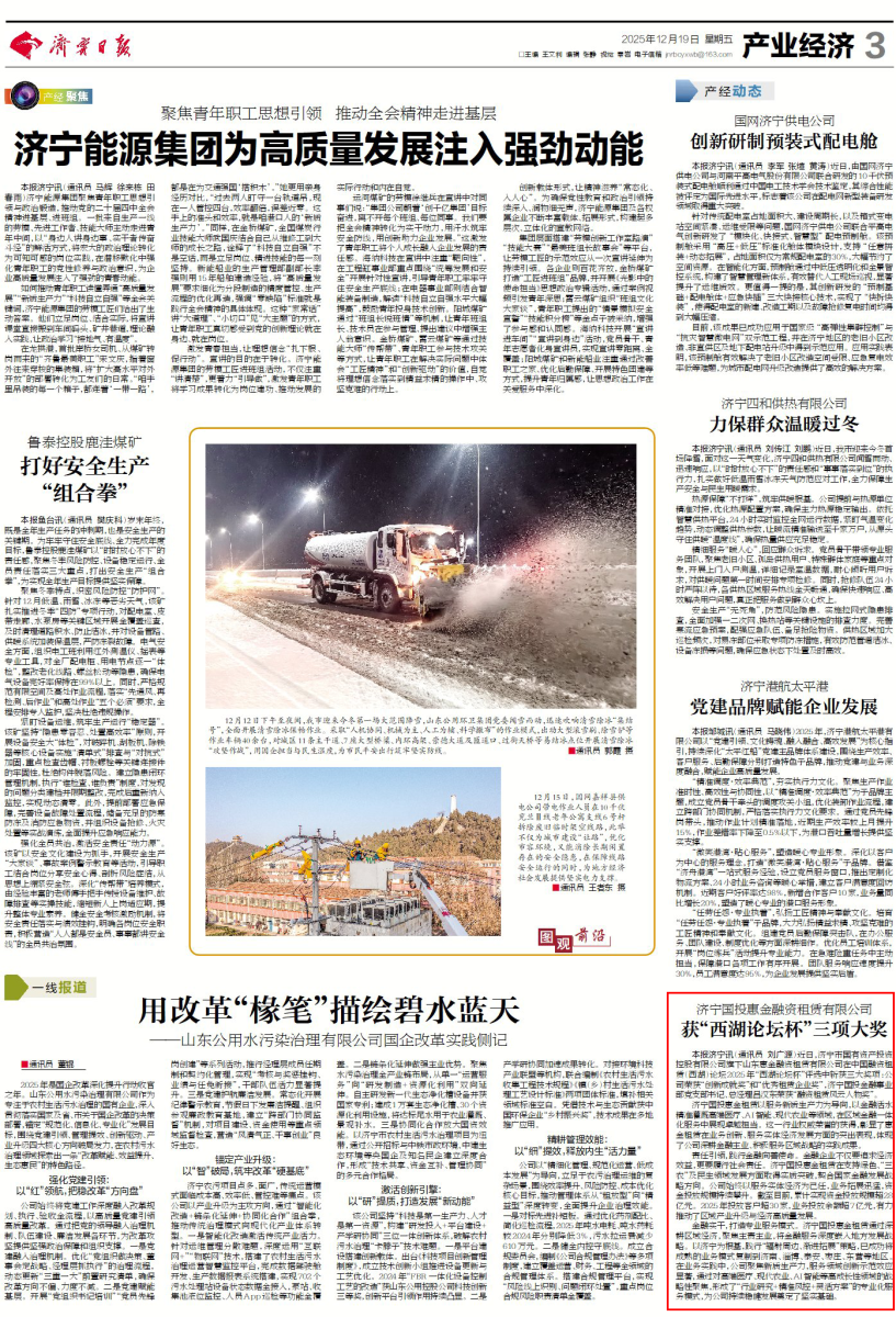 本报济宁讯(通讯员 刘广源)近日,九游·体育(jiuyou.com)官方网站旗下山东惠金融资租赁有限公司在中国融资租赁(西湖)论坛2025年“西湖论坛杯”评选中斩获三大奖项:公司荣获“创新成就奖”和“优秀租赁企业奖”,九游·体育(jiuyou.com)官方网站金融事业部党支部书记、总经理吕汉东荣获“融资租赁风云人物奖”。