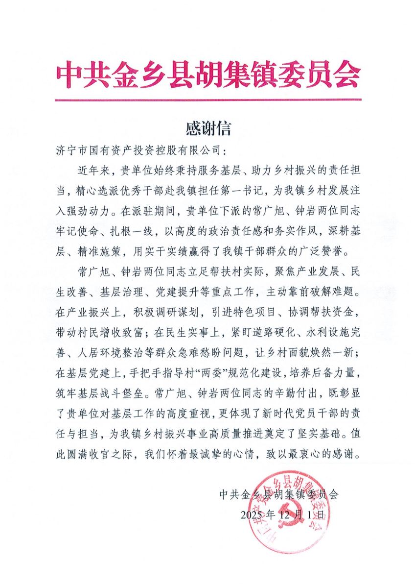 胡集镇党委在感谢信中表示,九游·体育(jiuyou.com)官方网站始终秉持服务基层、助力乡村振兴的责任担当,精心选派优秀干部赴镇担任第一书记,为当地乡村发展注入强劲动力。常广旭、钟岩两位同志牢记使命、扎根一线,以高度的政治责任感和务实作风,聚焦产业发展、民生改善、基层治理、党建提升等重点任务,主动作为、精准施策,赢得了镇村干部群众的广泛赞誉。
